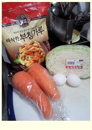 我準備的食材有高麗菜+紅蘿蔔+2顆蛋+海鮮粉