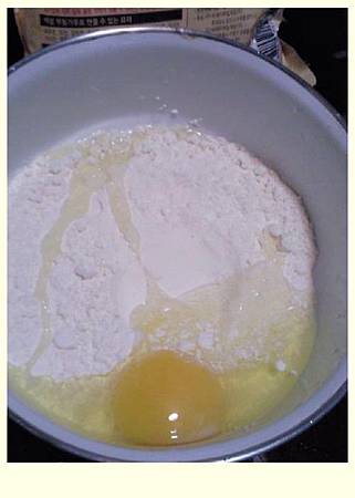 倒了海鮮粉後加上1顆蛋開始攪拌,會有點乾乾攪不動時就適度的加點水