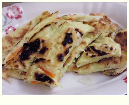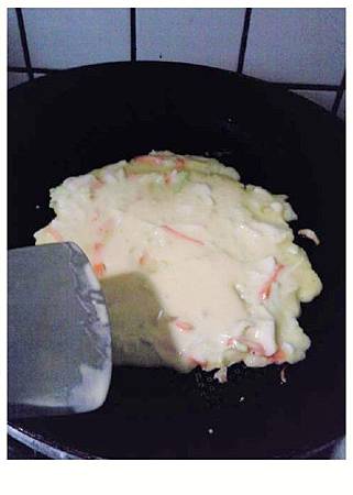 到攪拌差不多時就可放上已切好的菜絲(高麗菜+紅蘿蔔)再稍微攪拌。